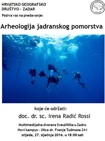 - 27 January 2016 – Arheologija jadranskog pomorstva / Archaeology of Adriatic Seafaring (Irena Radić Rossi) - Croatian Geographical Society – Zadar, New Campus, Zadar (Croatia) Poster
